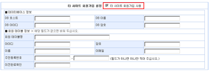 운영중인 타 사이트의 회원을 손쉽게 아사프로의 회원으로 가입 시킬 수 있는 기능입니다. 이미 운영중인 타 사이트의 DB정보를 설정해 두면 로그인 시 타 사이트의 회원 정보를 가지고 올 수 있습니다. 타 사이트 회원가입 사용에 체크를 하면 아래 그림과 같이 몇가지 정보를 입력하는 란이 나옵니다.