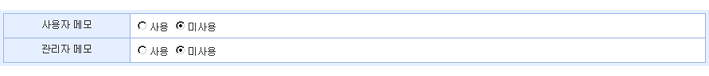 사용자 메모와 관리자 메모의 사용여부를 선택할 수 있습니다. 사용으로 선택 시 사용자화면의 정보수정, 관리자 화면의 회원관리부분에 메모란이 추가 됩니다.