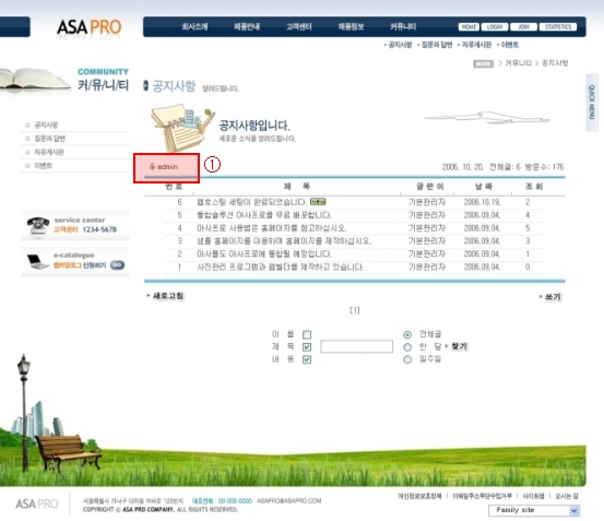 • 1. 메인페이지의 하단부분에 있는 ①의 아사프로 관리자 모드 배너를 클릭하면 새창으로 관리자 페이지가 뜨게 됩니다. 여기서 관리자 로그인을 하시면 접속됩니다. 초기 아이디와 암호는 FTP 아이디, 암호와 동일합니다.
