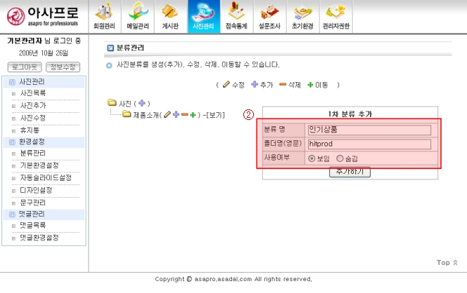 2. 관리자에 접속 후 ②에서 처럼 1차 분류를 추가합니다. 분류명과 폴더명을 입력 후 보임을 체크합니다.