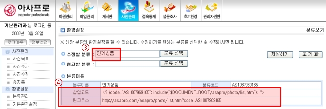 3. 왼쪽 메뉴의 환경 설정을 클릭하시면 생성된 분류의 삽입코드와 링크 주소[④]를 확인할 수 있습니다. 삽입코드 확인 시 수정할 분류를[③] 확인하시기 바랍니다.