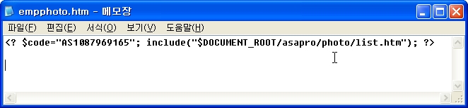 • 1. 그림과 직원사진분류의 삽입 코드를 적용시킬 문서를 메모장같은 프로그램으로 작성합니다. 적용 후 문서 이름을 hitprod.htm[가칭]으로 정하고 /asapro/photo/에 저장합니다.