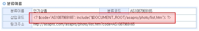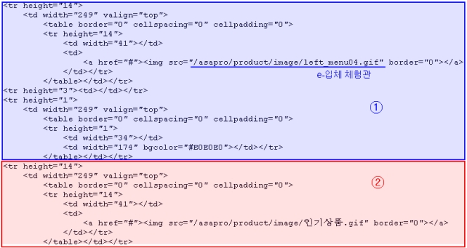 2. 위 그림 ②부분에 위의 코드를 삽입합니다. 이때 위 코드는 이미 이미지를 /asapro/ image/index/폴더에 photo_left03.gif라는 이름으로 만들었을 경우 해당됩니다.