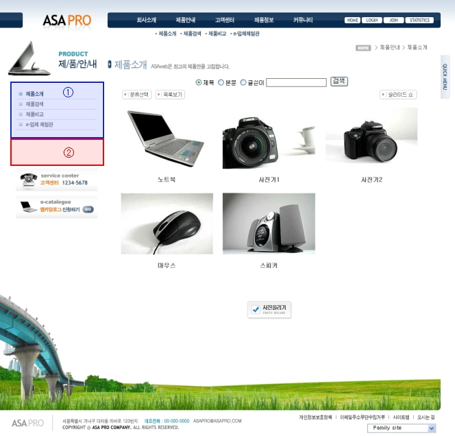 • 1. 왼쪽 메뉴가 있는 문서를 열어서 확인합니다. /asapro/product/photo/left.htm 문서를 열어 확인해 보면 그림과 ①과 같이 이미 코딩이 되어진 부분이 있습니다. 이제 왼쪽 메뉴에 새롭게 추가할 이미지를 만듭니다. 만들어진 이미지는 ②부분에 삽입되어 집니다. 이때 왼쪽 메뉴는 텍스트로 하셔도 됩니다.