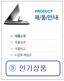 3. 왼쪽 메뉴의 경우는 텍스트로 만들어 링크를 걸어도 됩니다. 단, 링크의 경우는 조금전에 만들었던 /asapro/product/hitprod.htm[가칭]으로 하셔야 새롭게 생성된 갤러리를 확인할 수 있습니다.