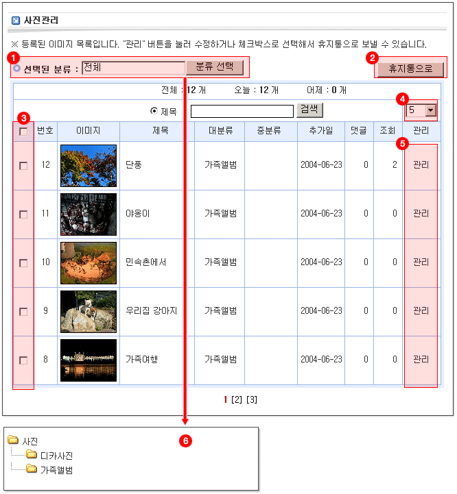 위 그림 ⑤번의 관리를 클릭하시면 각 사진 이미지의 관리 페이지로 이동합니다. |