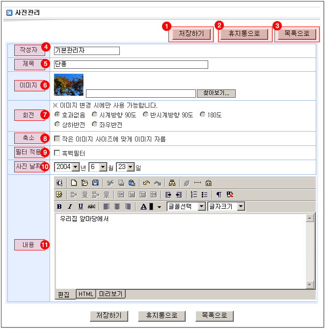 5. 관리 : 각각의 이미지를 관리 수정합니다. 아래에서 부터 관리에 대한 매뉴얼이 계속됩니다.