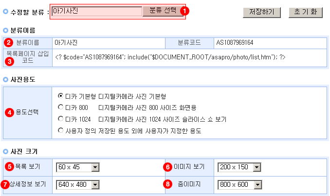 1. 수정할 분류 : 자신이 관리할 수 있는 사진 분류 목록을 선택박스로 보여줍니다. 먼저 분류를 선택합니다.