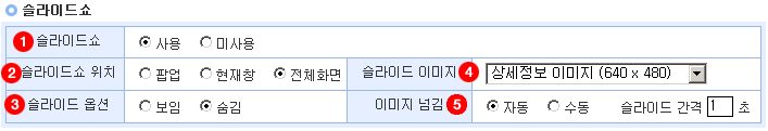 3. 슬라이드 이미지 : 선택박스에서 선택된 크기로 슬라이드 쇼가 진행됩니다.