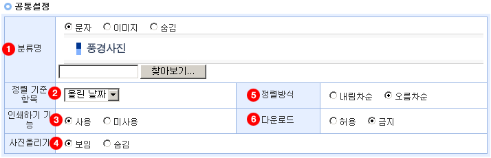 1. 사진올리기 : 사진올리기 권한을 선택할 수 있습니다. 권한의 설정은 회원관리프로그램에서 변경하십시오
