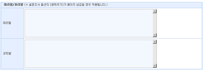 설문조사 옵션의 [창띄우기]가 페이지 넘김일 경우 적용됩니다. 설문조사 상단이나 하단에 이미지나 텍스트문구를 넣을 수 있습니다. |