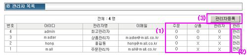 - (1) 권한설정 : 쇼핑몰 관리자 메뉴 중 접근 가능 권한을 설정합니다. O로 표시된 부분은 접근 가능한 것이고, X로 표시된 부분은 접근 가능하지 않은 것입니다.