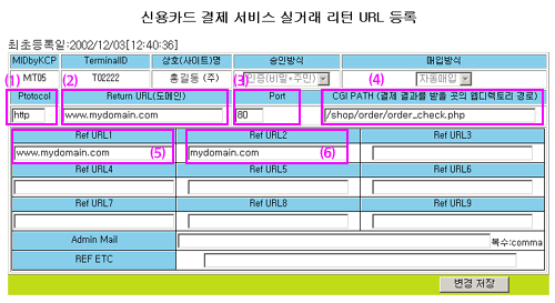 ※ Return URL, Ref URL1,2..는 도메인명 외에 다른 것이 들어가면 제대로 동작안할 수 있습니다.