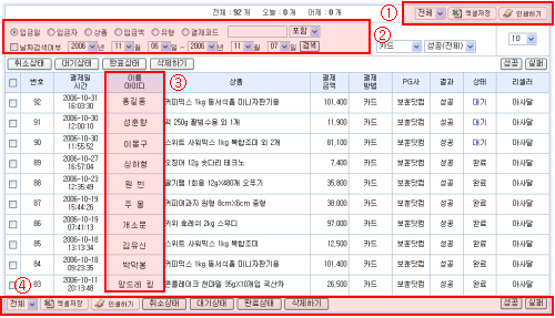 - ② 입금일/입금자/상품/입금액/유형/결제코드 등의 다양한 조건으로 검색할 수 있습니다.
