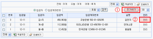 은행입금 관리를 클릭하면 아래와 같은 페이지를 볼 수 있습니다. 은행계좌번호를 추가/수정/삭제할 수 있습니다.