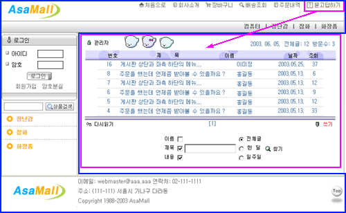 • 그림과 같이 쇼핑몰에 링크되어 있는 게시판에 쇼핑몰의 상단 메뉴와 왼쪽 메뉴, 그리고 하단의 카피라이트 부분이 게시판과 함께 나오게 하고 싶을 때의 사용방법입니다.