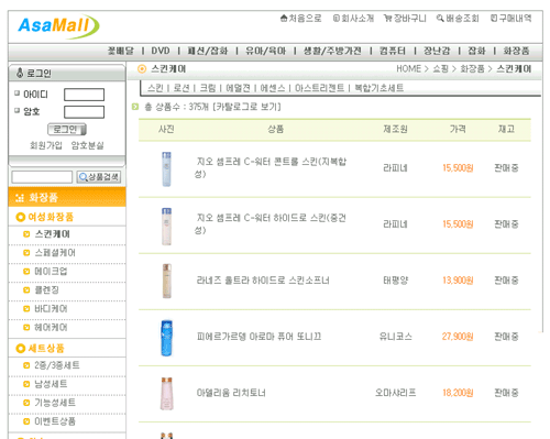 상품의 작은 사진과 상품명, 제조원, 가격, 재고 여부를 볼 수 있습니다.
