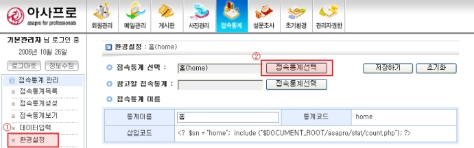 관리자모드 접속통계에서 ①의 환경설정을 클릭합니다. ②의 접속통계선택을 클릭한 후 새로 등록한 접속통계 분류를 선택하면 해당 접속통계에 대한 환경설정으로 화면이 바뀌게 됩니다.