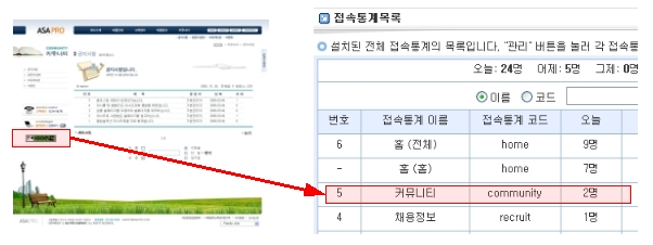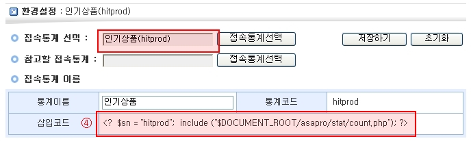 접속통계를 원하는 분류를 생성했다고 해서 방문자수가 기록되는 것이 아닙니다. 분류 생성 후 반드시 접속자수를 파악하고자 원하는 페이지에 소스 코드를 삽입하셔야 합니다.