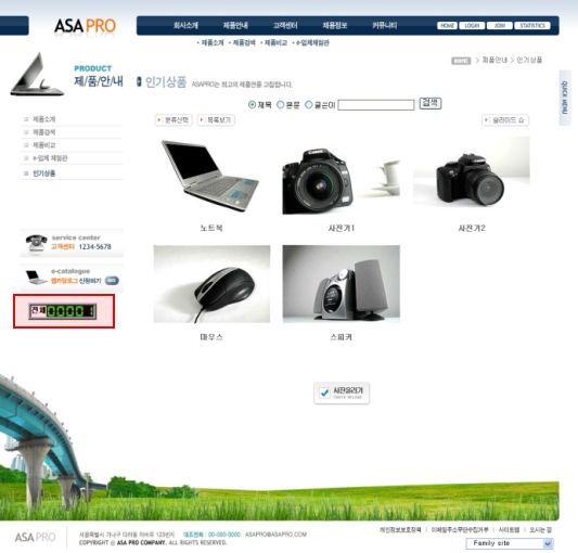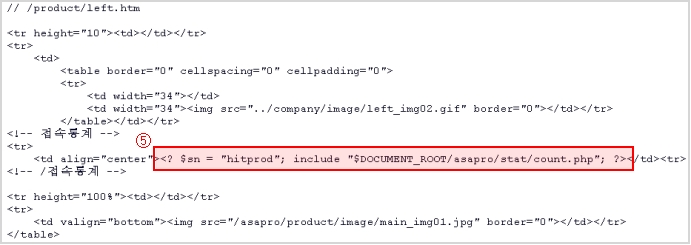④의 삽입코드를 복사하여 삽입하고자 하는 페이지에 붙여 넣기 합니다. 예를 들어 게시판 페이지에 추가하고자 할 경우 /product/left.htm 파일에 ⑤와 같이 붙여 넣기를 하면 게시판 페이지의 방문자 수를 확인할 수 있는 접속통계가 삽입된 것입니다.