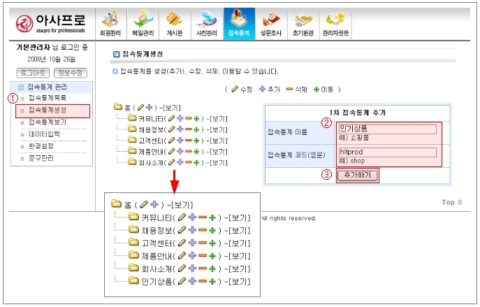 관리자모드 접속통계에서 ①의 접속통계 생성을 클릭합니다. 1차 접속통계 추가 입력란에 새로 추가할 접속통계 이름과 코드명을 입력한 후 "추가하기"버튼을 클릭하면 왼쪽 분류에 "게시판"이 추가되었음을 알 수 있습니다.