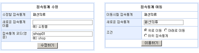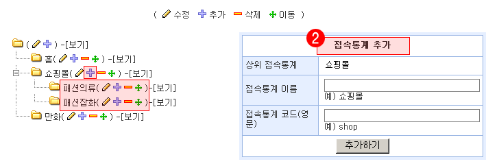 2. 접속통계 추가 : 쇼핑몰분류의 "추가" 아이콘을 누르면 추가생성할 수 있습니다. 좌측의 패션의류, 패션잡화에 해당하는 부분입니다.패션의류 밑으로 접속통계 분류를 더 넣고 싶을 경우 "추가"아이콘을 클릭하시면 하위분류를 계속 추가할 수 있습니다. 추가하고 싶은 접속통계 이름과 코드명을 넣고 "추가하기"버튼을 누르면 생성되고 접속통계목록 부분에도 추가됩니다.