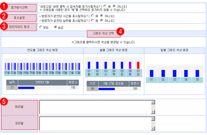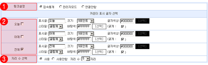 1. 증가방식 선택 : "새로고침" 버튼 클릭 시 접속수 증가여부를 설정할 수 있습니다.