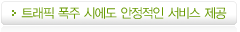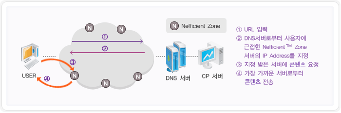 인터넷 이용자의 접속위치 정보와 Nefficient™ Zone 서버의 상태를 반영한 글로벌 로드밸런싱을 통해 최적의 전송경로를 선택하여 콘텐츠를 전송함으로써 동시접속자가 증가하여도 동일한 속도와 품질을 보장하며, 트래픽 폭주로 인한 서버의 성능저하를 방지하므로 안정적인 서비스가 가능합니다.