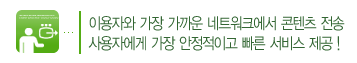 CDN(콘텐츠 전송네트워크) 서비스는 주요 ISP 센터에 동기화된 콘텐츠 전용 서버를 설치하여 이용자가 요구할 때 가장 가까운 곳에서 콘텐츠를 안정적으로 빠르게 받을 수 있도록 서비스를 제공하는 것을 말합니다.