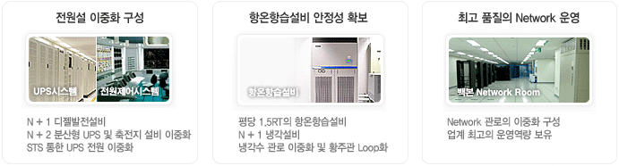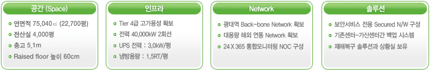 | 40000KW급의 대용량 전력설비, 전산장비의 냉각 효율을 극대화하고 운영의 안정성을 확보한 고효율 냉각시스템 등을 통해 인프라 가용성도 매우 좋습니다. |