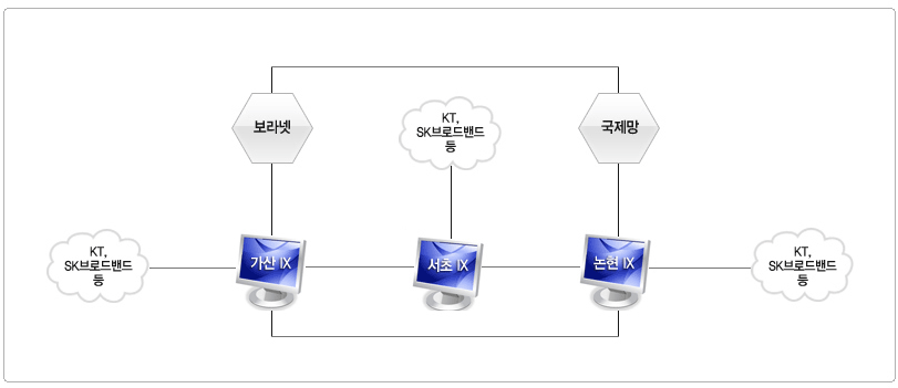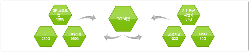 | 국내망은 국내 모든 IPS 사업자와 연동되어 있으며 KT, SK 브로드밴드와 대용량 연동망을 구성하고 있습니다. |