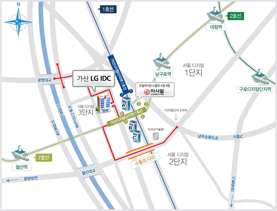 | 가산 LG IDC는 다수의 IT 업체가 입주한 서울/가산 디지털밸리 중심에 위치해 있습니다. 교통편은 가산디지털단지역에서 100m(1호선/7호선 환승역)이며 서부간선도로와 남부순환로를 통한 차량접근에 용이합니다. |