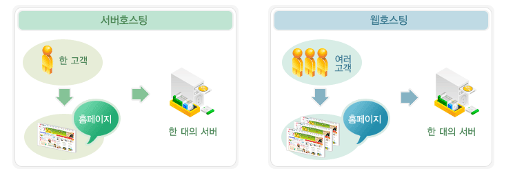서버호스팅은 한 서버를 한 고객이 이용하여 하나의 사이트 또는 다수의 사이트를 운영할 수 있는 서비스고 웹호스팅은 한 서버를 여러 고객이 이용하며 한 고객당 하나의 사이트를 운영하는 서비스입니다.